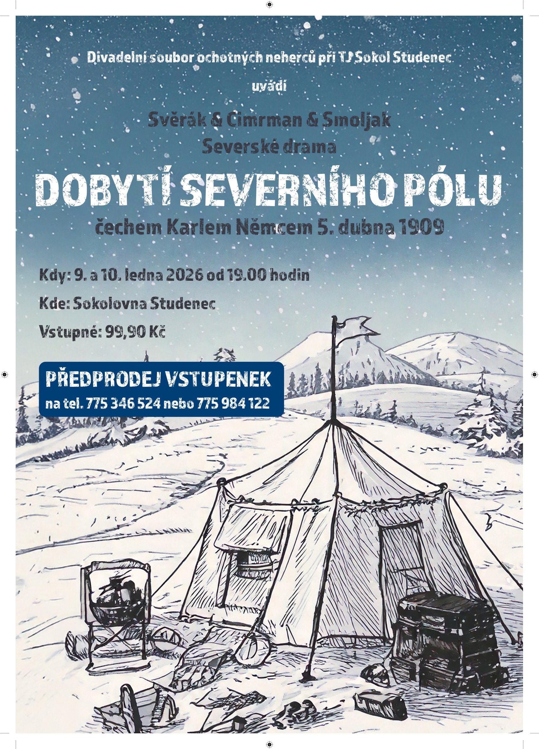 Divadelní soubor ochotných neherců při TJ Sokol Studenec uvádí 9. a 10. ledna 2026 hru divadla Járy Cimrmana „Dobytí severního pólu čechem Karlem Němcem“ Vstupenky pouze v předprodeji na tel. 775 346 524 nebo 775 984 122