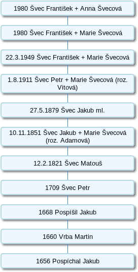 Majitelem tohoto gruntu byl v roce 1656 Jakub Pospíchal. V roce 1660 se novým hospodářem stal Martin Vrba, ale už v roce 1668 byl připomínán Jakub Pospíšil. Švec Petr obdržel grunt v roce 1709 a v tomto rodě se dům udržel až do dnešních dob, jmenovitě: Od 12. 2. 1821 Matouš Švec, kdy grunt poměrně pozdě zakupuje od vrchnosti, od 12. 2. 1821 je uváděn Švec Matouš, od 10. 11. 1851 manželé Jakub Švec a Marie Švecová roz. Adamová, od 27. 5. 1879 Švec Jakub, od 1. 8. 1911 Petr a Marie (roz. Vítová) Švecovi, od 22. 3. 1949 František a Marie Švecovi a od 1980 František a Anna Švecovi.