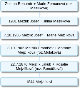 Před rokem 1844 náležel tento dům rodině Tesařově. V tomto rose se dle matričních záznamů na domě č. p. 18 objevuje rodina Mejzlíkova. 22. 7. 1876 známe již zápis z gruntovní knihy o Jakubu Mejzlíkovi a Rosalii Mejzlíkové roz. Benáčkové. Dalšími držiteli gruntu byli od 3. 10. 1902 František Mejzlík a Antonie Mejzlíkovrá roz. Moláková, od 7. 10. 1936 Mezlík Josef (opět došlo k úpravě příjmení jako u Mezlíků č. 7) a od 1981 Mezlík Josef a Jiřina Mezlíková. V současné době je vyženěním č. p. 18 v držení rodiny Zemanů.