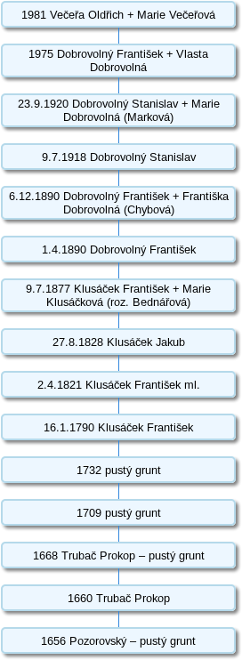 Tento grunt byl před rokem 1656 zvaný Pozorovský, v tomto roce byl však již pustý. 1660 byl dům v majetku Trubače Prokopa, ale již v roce 1668 je uváděn opět jako pustý a zůstal jím bezpečně až do roku 1732. Prvním rodem s kontinuální držbou doloženou písemnou zprávou je rod Klusáčků. František Klusáček zakoupil grunt od vrchnosti 16. 1. 1790 a vzdal se ho ve prospěch syna Františka až 2. 4. 1821. František s manželkou Pavlínou vychovali syna Jakuba, kterému předali grunt již 27. 8. 1828. Jeho žena Františka Klusáčková zdědila 15. 1. 1867 po jeho úmrtí celý grunt a znovu se provdala za Jana Večeřu, který měl právo hospodařit na gruntě do zletilosti jednoho z dětí z Františčina prvního manželství. Tak byl grunt 9. 7. 1877 zapsán Františku a Marii Klusáčkovým (roz. Bednářová). Ti se však dostali velmi brzy vinou velkých podílových vyrovnání se sourozenci a odstupujícím hospodářem do finanční krize, a proto byl grunt 27. 3. 1890 prodán Františku Dobrovolnému. Ten grunt předal 9. 7. 1918 Stanislavu Dobrovolnému, který jej v roce 1975 předal Františkovi a Vlastě Dobrovolným. V roce 1976 se do tohoto domu z č. p. 96 přiženil Večeřa Oldřich a v držení jeho rodu je tento dům dodnes.