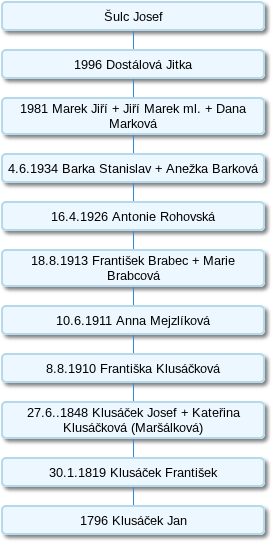 Tento domek vybudoval vlastním nákladem roku 1796 Jan Klusáček. Po něm náležel dům Františku Klusáčkovi od 30. 1. 1819. Dalším držitelem byl od 27. 6. 1848 Klusáček Josef s Kateřinou Klusáčkovou roz. Maršálkovou. Poté následovaly časté změny majitele: 8. 8. 1910 naposledy Františka Klusáčková, poté od 10. 6. 1911 Anna Mejzlíková, pak od 18. 8. 1913 František a Marie Brabcovi, od 16. 4. 1926 Antonie Rohovská a od 4. 6. 1934 Stanislav a Anežka Barkovi. V současné době č. p. 21 této rodině již nenáleží a je obýván pouze sezónně.