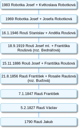 Rouš Jakub tento domek vybudoval se svolením vrchnosti a na vlastní náklad roku 1790. 5. 2. 1827 předal dům Václavu Roušovi, po kterém byl držitelem František Rouš. 21. 8. 1856 byl domek v držení manželů Františka a Rosalie Roušových, po nich od 15. 11. 1886 Josefa a Františky Roušových, od 18. 9. 1919 Josefa a Františky Roušových ml. a od 16. 1. 1946 Stanislava a Anděly Roušových. V současné době náleží domek rodině Robotkově.