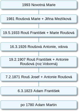 Tento domek vybudoval v roce 1780 Martin Adam. Od 6. 3. 1823 náležel Františku Adamovi, od 7. 2. 1871 náležel již manželům Josefu a Antonii Roušovým. 19. 2. 1907 byli majiteli František Rouš a Antonie Roušová roz. Voborná. Antoniin manžel zemřel v 1. sv. válce, vdova předala dům 19. 5. 1933 synovi Františkovi a jeho manželce Marii Roušové. V současné době dům náleží potomkům, ale už ne jmenovcům tohoto rodu a je obýván pouze sezónně.