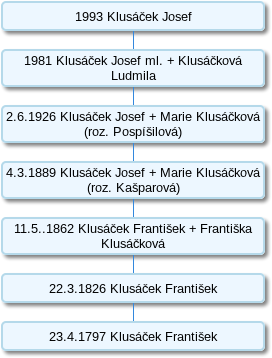 Prvním písemně doloženým majitelem tohoto gruntu byl František Klusáček, který jej 23. 4. 1797 zakoupil od vrchnosti. Po něm zdědil grunt 22. 3. 1826 jeho syn Klusáček František. V roce 1862 se jako majitelé stavení připomínají František a Františka Klusáčkovi. Od 4. 3. 1889 se vlastníky gruntu stali Josef a Marie Klusáčková (roz. Kašparová), od 2. 6. 1926 Josef a Marie Klusáčková (roz. Pospíšilová). V roce 1981 se vlastníky domu stali Josef a Ludmila Klusáčkovi a v roce 1993 Josef Klusáček. V majetku rodiny tohoto jména je č. p. 31 doposud.