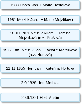 Tento grunt zakoupil od vrchnosti 20. 6. 1821 Martin Hort. 3. 9. 1828 dům vlastnil Mathias Hort. Od 21. 11. 1855 dům vlastnili Jan a Kateřina Hortovi. 15. 6. 1885 se vlastníkem domu díky svatbě s Rozálií Hortovou stal Mejzlík Jan. 18. 10. 1921 se domu ujali manželé Vilém a Tereza Mejzlíková. Od roku 1981 dům vlastnili dům Josef a Marie Mejzlíkovi. Od roku 1983 je grunt majetkem rodu Dostálu až dodnes.