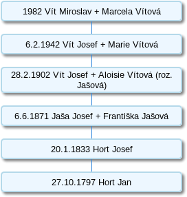 Tento grunt zakoupil od vrchnosti 27. 10. 1797 Jan Hort. Od něj dům převzal 20. 1. 1833 Hort Josef. Od 6. 6. 1871 se majiteli gruntu stali manželé Josef a Františka Jašovi. Sňatkem z 28. 2. 1902 s Aloisií Jašovou se na grunt přiženil Josef Vít. Od 6. 2. 1942 se majiteli domu stali manželé Josef a Marie Vítovi. Od roku 1982 jsou vlastníky domu Miroslav a Marcela Vítovi. Roku 1988 manželé postavili na místě staré výměnkářské chalupy, která stála u č. p. 32, novou patrovou novostavbu. Tento nový dům nese č. p. 108. V majetku rodiny Vítovy se oba domy nacházejí dodnes.