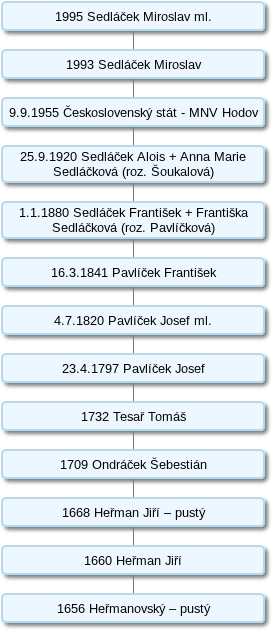 Tento lán byl před rokem 1650 v držení rodu Heřmanova. 1656 je uváděn jako pustý. 1660 je jako majitel uveden Heřaman Jiří, ale už roku 1668 grunt opět zpustl. Ondráček Šebestián je jako majitel připomínán v roce 1709. Tesař Tomáš byl majitelem 1732. Od vrchnosti tento grunt zakoupil Pavlíček Josef 23. 4. 1797. Ten předal grunt stejnojmennému synovi 4. 7. 1820. Dalším hospodářem byl od 16. 3. 1841 Pavlíček František. Na gruntě nezůstal žádný syn, pouze děvče – Františka. Tak se na dům přiženil František Sedláček. Manželům byl grunt zaknihován 1. 1. 1880. 25. 9. 1920 zde začali hospodařit Alois Sedláček a Anna Sedláčková, roz. Šoukalová. 9. 9. 1955 zasáhla krutě do svobodné držby tohoto domu tehdejší komunistická vláda, která rozhodla prostřednictvím soudních řízení o jeho vyvlastnění. Miroslav Sedláček byl s rodinou vystěhován do Žďáru nad Sázavou a jejich dům a pozemky se staly základem rodícího se družstva. Byla zde ustájena různá hospodářská zvířata a později v hospodářské budově u č. p. 5 byl dlouhá léta sklad chemikálií. To vše přispělo k tomu, že po změně režimu si Miroslav Sedláček (syn vystěhovaného Miroslava Sedláčka) mohl v roce 1993 v podstatě převzít ruinu. Starý dům byl zbořen, postaven nový a Miroslav Sedláček je v dnešní době jediný soukromě hospodařící zemědělec v obci.