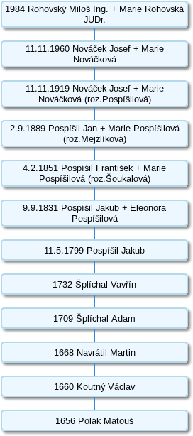 Majitelem tohoto gruntu byl roku 1656 Polák Matouš. V roce 1660 je připomínán Koutný Václav, od roku 1668 Navrátil Martin, od 1709 Šplíchal Adam a od 1732 Šplíchal Vavřinec. Od vrchnosti dům zakoupil 11. 5. 1799 Pospíšil Jakub. Od 9. 9. 1831 se vlastníky domu stali Jakub a Eleonora Pospíšilovi, po kterých se domu 4. 2. 1851 ujali František a Marie Pospíšilovi. 2. 9. 1889 byli vlastníky domu Jan a Marie Pospíšilovi. Svatbou s jejich dcerou Marií Pospíšilovou se do domu přiženil Josef Nováček. Oběma manželům byl dům zaknihován 11. 11. 1919. Manželé Josef a Marie Nováčkovi se majiteli domu stali od 11. 11. 1960. Sňatkem s Marií Nováčkovou se do domu přiženil Miloš Rohovský. Oběma manželům byl dům zaknihován roku 1984 a ve vlastnictví tohoto rodu je doposud.