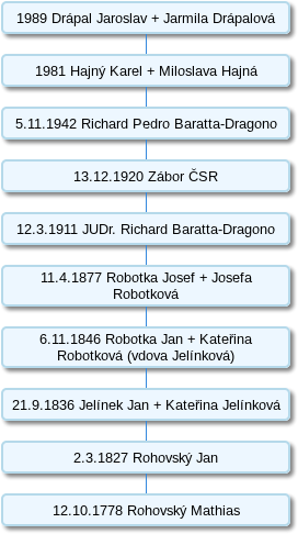 Prvním známým majitelem byl od 12. 10. 1778 Rohovský Mathias. Po něm dům patřil od 2. 3. 1827 Rohovskému Janovi. Roku 1836 dům od Jana koupili manželé Jan a Kateřina Jelínkovi. Robotka Jan získal dům v roce 1846, kdy se oženil s vdovou Kateřinou Jelínkovou. Manželům Josefě a Josefu Robotkovým dům náležel od roku 1877. JUDr. Richard Baratta-Dragono domek od Robotkových zakoupil 2. 3. 1911. Ubytoval zde svého hajného Jan Mejzlíka. Dům poté různě měnil majitele, přecházel z Barattů na stát, až byl nakonec definitivně po roce 1945 zestátněn a posléze nabídnut k prodeji. V roce 1981 náležel rodině Hajných a od roku 1989 rodině Drápalově až dodnes.