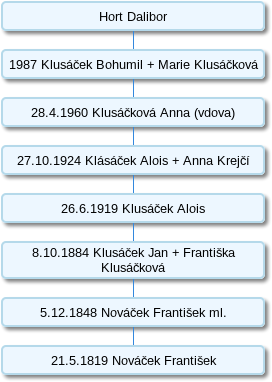 Prvním písemně doloženým majitelem tohoto domku byl od 21. 5. 1819 František Nováček, po kterém se ho ujal roku 1848 jeho stejnojmenný syn. Od 8. 10. 1884 dům vlastnili Jan a Františka Klusáčkovy, po nich se domu ujal od 26. 6. 1919 Alois Klusáček, jenž se v roce 1924 oženil s Annou Krejčí. Ta roku 1960 ovdověla a posléze se domu v roce 1987 ujal Bohumil Klusáček. Ten již domek trvale neobýval, byl využíván pro rekreační účely. Po roce 2000 byl domek prodán rodině Hortových, kteří jej opravili a obývají dodnes.
