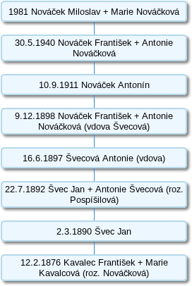 Dům 12. 2. 1876 vystavěli František a Marie Kavalcovi, na pozemcích oddělených od č. p. 32, avšak tento dům již 2. 3. 1890 náležel Janu Švecovi. Ten si v roce 1892 vzal Antonii Pospíšilovou, která se již v roce 1897 stala vdovou. Tu si roku 1898 vzal František Nováček. Jejich syn Nováček Antonín se domu ujal 10. 9. 1911. Od 30. 5. 1940 na gruntě hospodařili František a Antonie Nováčkovi a od roku 1981 Miloslav a Marie Nováčkovi. Této rodině grunt náleží doposud.