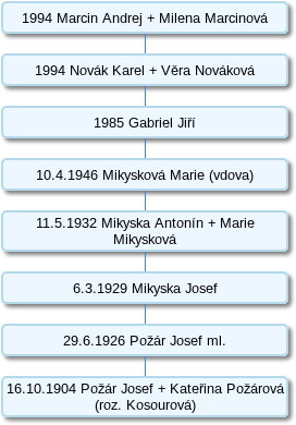 Tento domek vznikl odtržením části č. p. 1. Roku 1904 se na tomto čísle připomíná Josef a Kateřina Požárovi. Od roku 29. 6. 1926 byl na tomto čísle Josef Požár ml. Od 6. 3. 1929 náležel dům Josefu Mikyskovi a od 11. 5. 1932 Antonínu a Marii Mikyskovým. Marie Mikysková o několik let později ovdověla a jako jediná majitelka byla zapsána 10. 4. 1946. Od roku 1985 dům náležel Gabrielovi Jiřímu. Roku 1994 byl dům zapsán Karlu a Věře Novákovým. Od roku 1994 podnes dům vlastní rodina Marcinova.