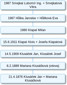 Tento dům vystavěli 21. 4. 1876 Jan a Marie Klusáčkovi. Od roku 1909 náležel dům Janovi a Josefovi Klusáčkovým. Od roku 1911 náležel dům rodině Klapalově, od roku 1980 patřil Milanu Klapalovi. V roce 1987 dům vlastnila rodina Hůlkova a po nich rod Smejkalů, který jej vlastní dodnes.