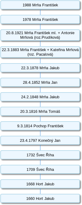 1660 je připomínán jako majitel gruntu Hort Jakub. Ten byl roku 1709 nahrazen Švecem Říhou, který je zmiňován i v roce 1732. Zakoupen od vrchnosti byl dům 23. 4. 1797 Janem Konečným. 9. 3. 1814 prodal grunt Pochopovi Františkovi, který jej obratem 20. 3. 1816 prodal Mrňovi Tomášovi. Jakub Mrň po smrti otce dostal grunt 24. 2. 1848. Dalším majitelem byl již 28. 4. 1852 Jan Mrňa. 22. 3. 1878 byl vlastníkem Jakub Mrňa, po něm od 22. 3. 1883 manželé František a Kateřina (roz. Pacalová) Mrňovi a nakonec 20. 8. 1921 František Mrňa a Antonie Mrňová (roz. Prudíková). Další František Mrňa vlastnil dům od 1978 a poté jeho stejnojmenný syn od 1988 dodnes. K výrazné přestavbě domu došlo právě v tomto roce, kdy byla část domu u č. p. 7 zbořena a na tomto místě postavena patrová novostavba.