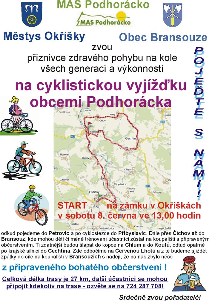 Městys Okříšky, MAS Podhorácko a obec Bransouze zvou příznice zdravého pohybu na kole všech generací a výkonností na cyklistickou vyjížďku obcemi Podhorácka.