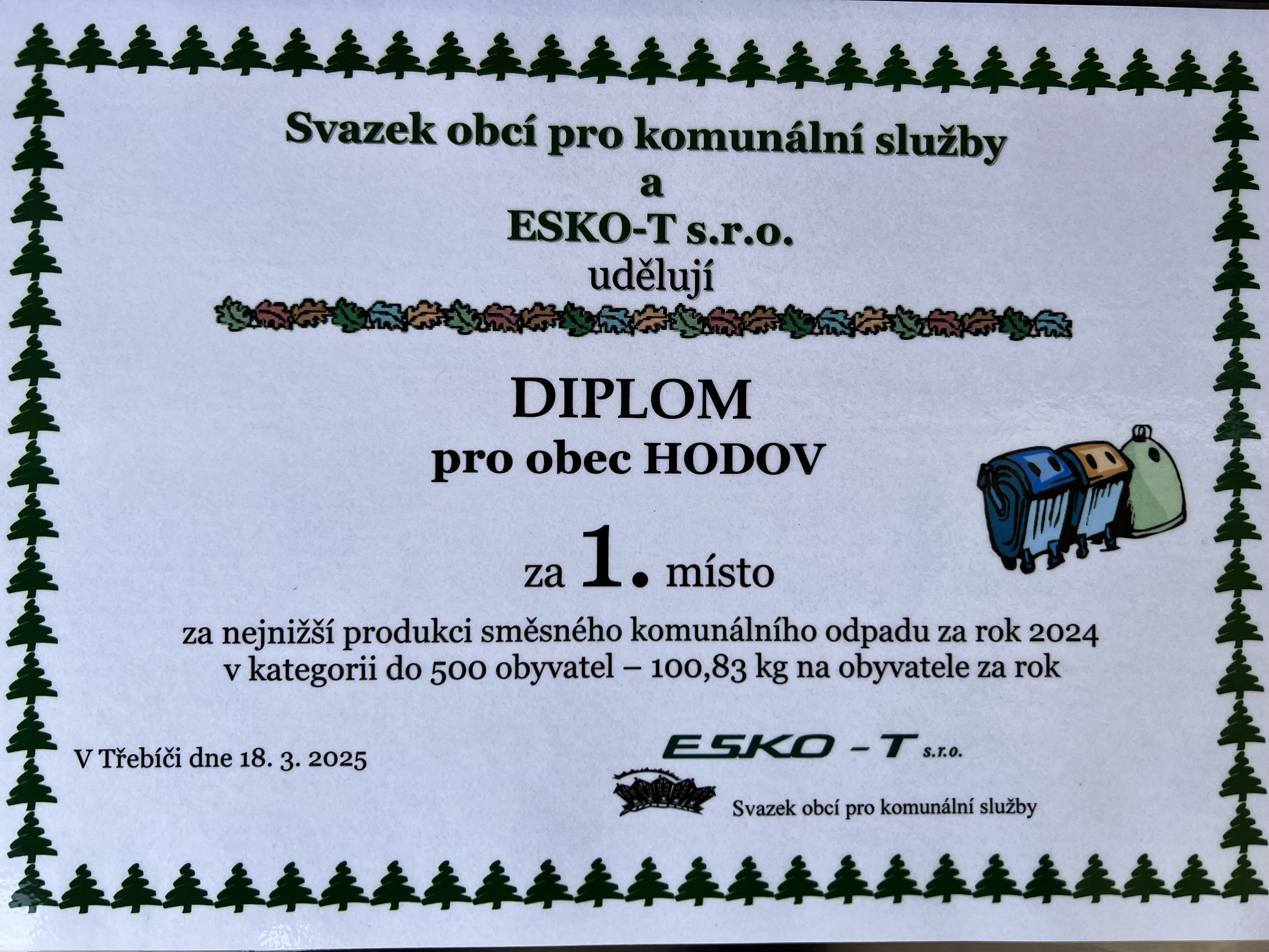 za nejnižsší produkci směsného komunálního odpadu za rok 2024 v kategorii do 500 obyvatel – 100,83 kg na obyvatele za rok. Za tento výsledek Obec Hodov obdržela finanční odměnu 5000 Kč.