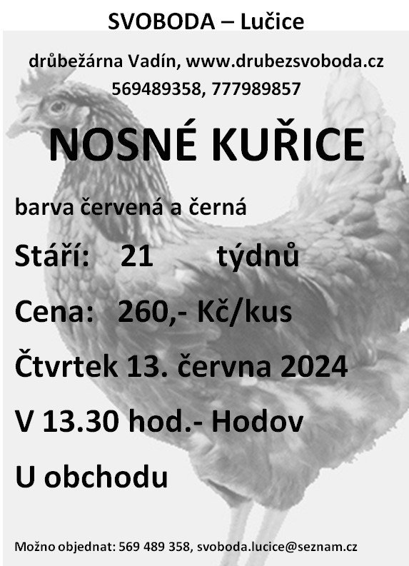 Firma Svoboda Lučice bude prodávat ve čtvrtek 13. června 2024 v 13.30 hodin u obchodu nosné kuřice, stáří 21 týdnů, cena 260,– Kč/kus, barva červená a černá.