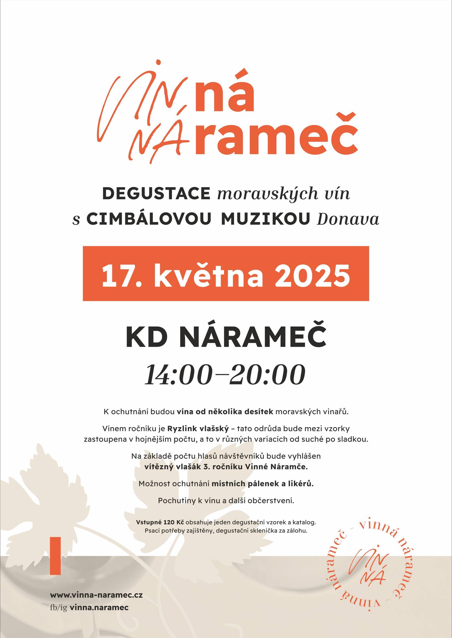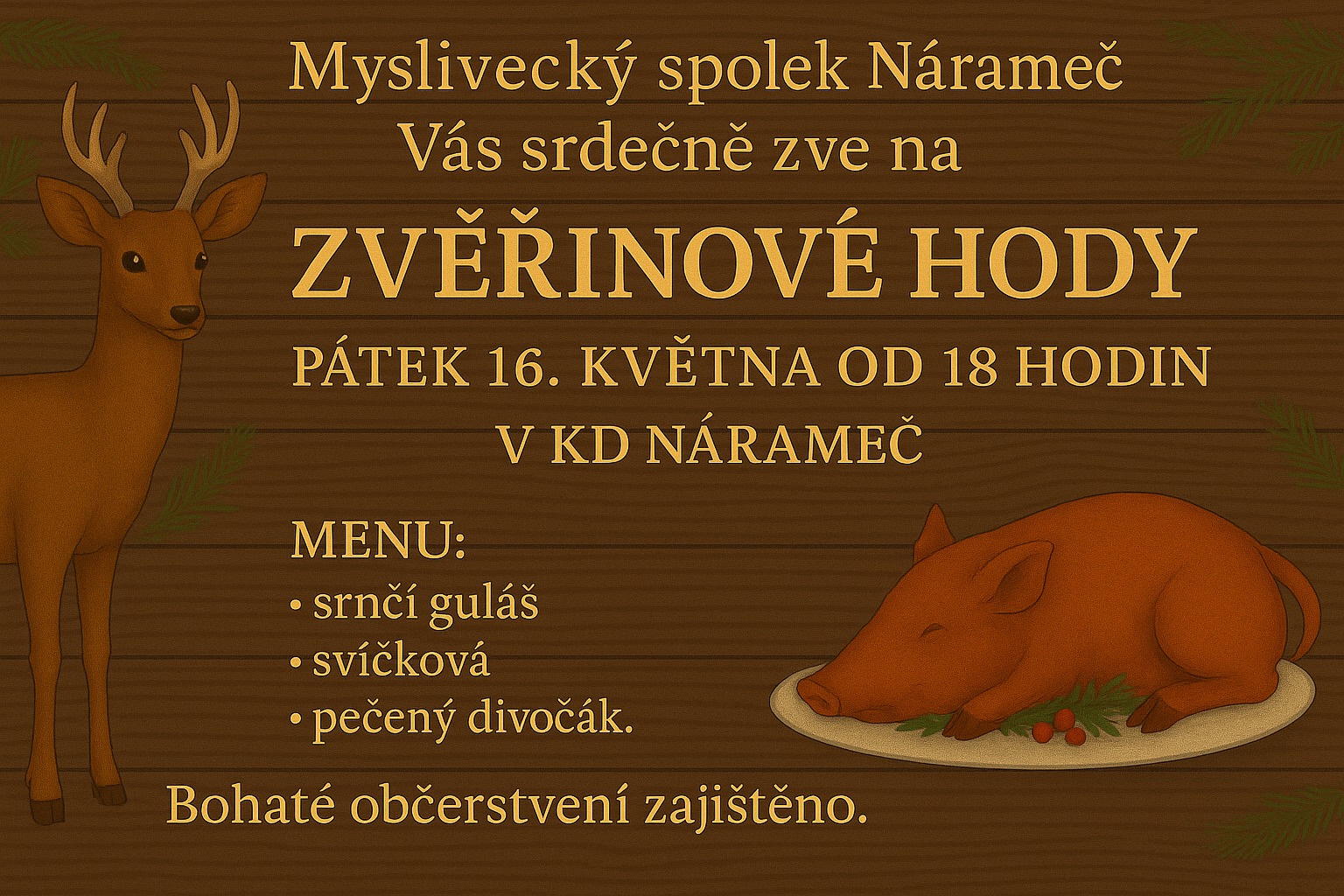 Pátek 16.5. 2025 Zvěřinové hody v KD od 18 hodin. Sobota 17.5. Vinná Nárameč od 14 hodin v KD, ochutnávka vín z jižní Moravy, cimbálová muzika Donava, zabíjačkové speciality, pivo, limo. Neděle 18.5. Mše svatá za KD od 14 hodin, od 15 hodin Sousedské posezení s harmonikou Po celý víkend budou kolotoče na dětském hřišti za prodejnou COOP.