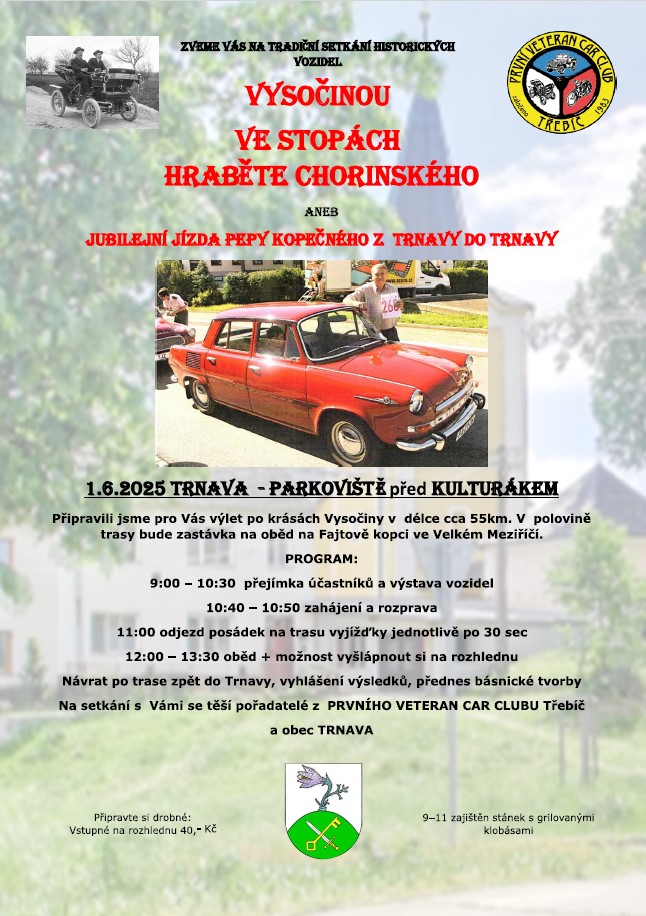 V neděli 1.června 2025 bude z Trnavy u Třebíče startovat spanilá jízda auto/moto veteránů na trasu TRNAVA – RUDÍKOV – HROZNATÍN – BOCHOVICE – HORNÍ HEŘMANICE – UHŘÍNOV – VELKÉ MEZIŘÍČÍ – PETRÁVEČ – DOLNÍ HEŘMANICE – OSLAVA – STUDNICE – KUNDELOV – HODOV – NÁRAMEČ – TRNAVA.