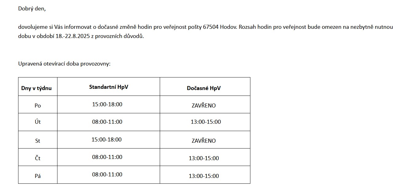 Jste zdeObecní úřad / Úřední deska / Aktuality / 18.-22.8. - změna otevírací doby pošty Hodov