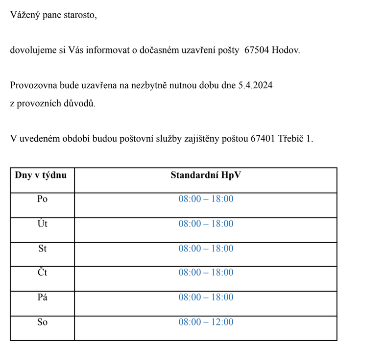 Jste zdeObecní úřad / Úřední deska / Pošta Hodov / 5. 4. 2024 - uzavřená pošta Hodov