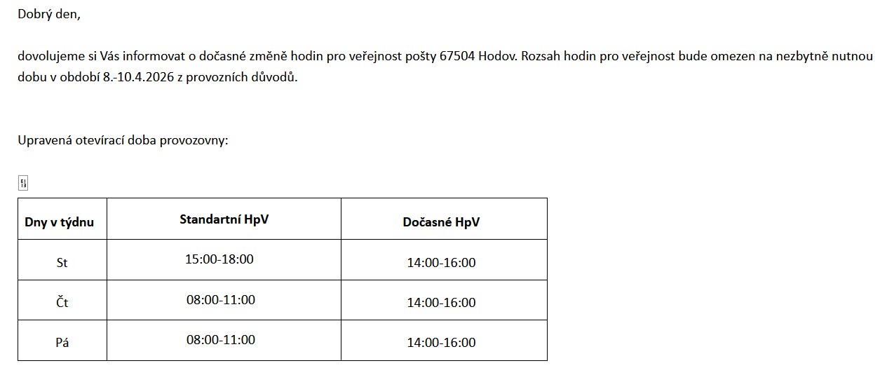 8.-10.4.2026 - změna provozní doby pošty 675 04 Hodov