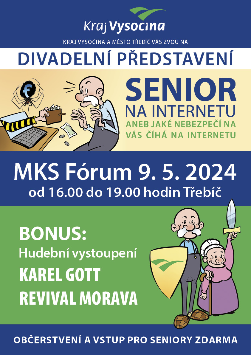 Ve spolupráci s Městem Třebíč, Krajským ředitelstvím policie kraje Vysočina a herci Divadla na Kopečku připravil Kraj Vysočina edukativně-zábavné divadelní představení Senior na internetu, které se odehraje 9. května ve Fóru.