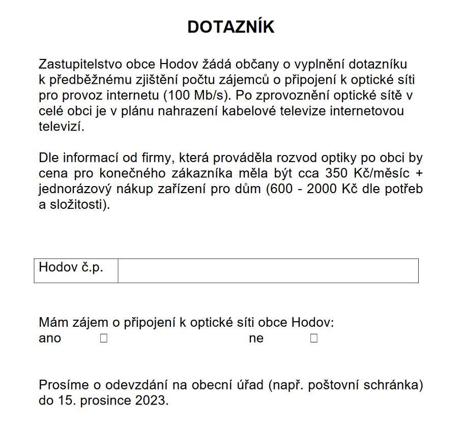 Jste zdeObecní úřad / Úřední deska / Kabelová televize / Dotazník - optika
