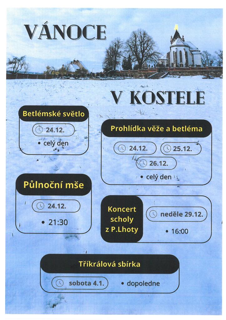 Milí občané, zvu Vás do našeho kostela o Vánocích 2024. Přijďte si pro Betlémské světlo a prohlédnout betlém, přijďte na půlnoční, vystupte na věž podívat se na (zasněženou) krajinu. :)